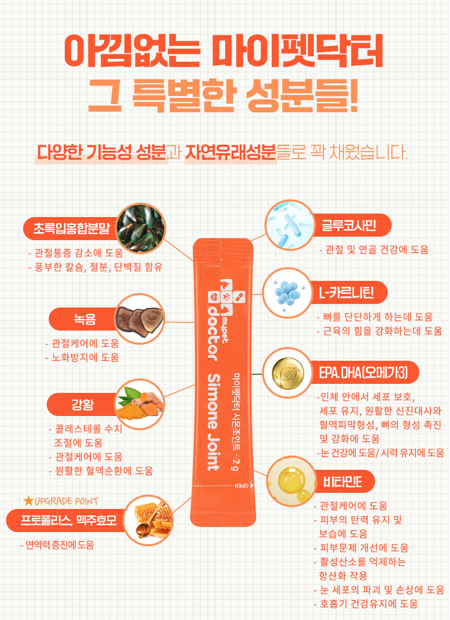 위 성분들은 사람에게나 강아지에게나 모두 관절건강에 유지하는데 큰 도움을 줍니다.